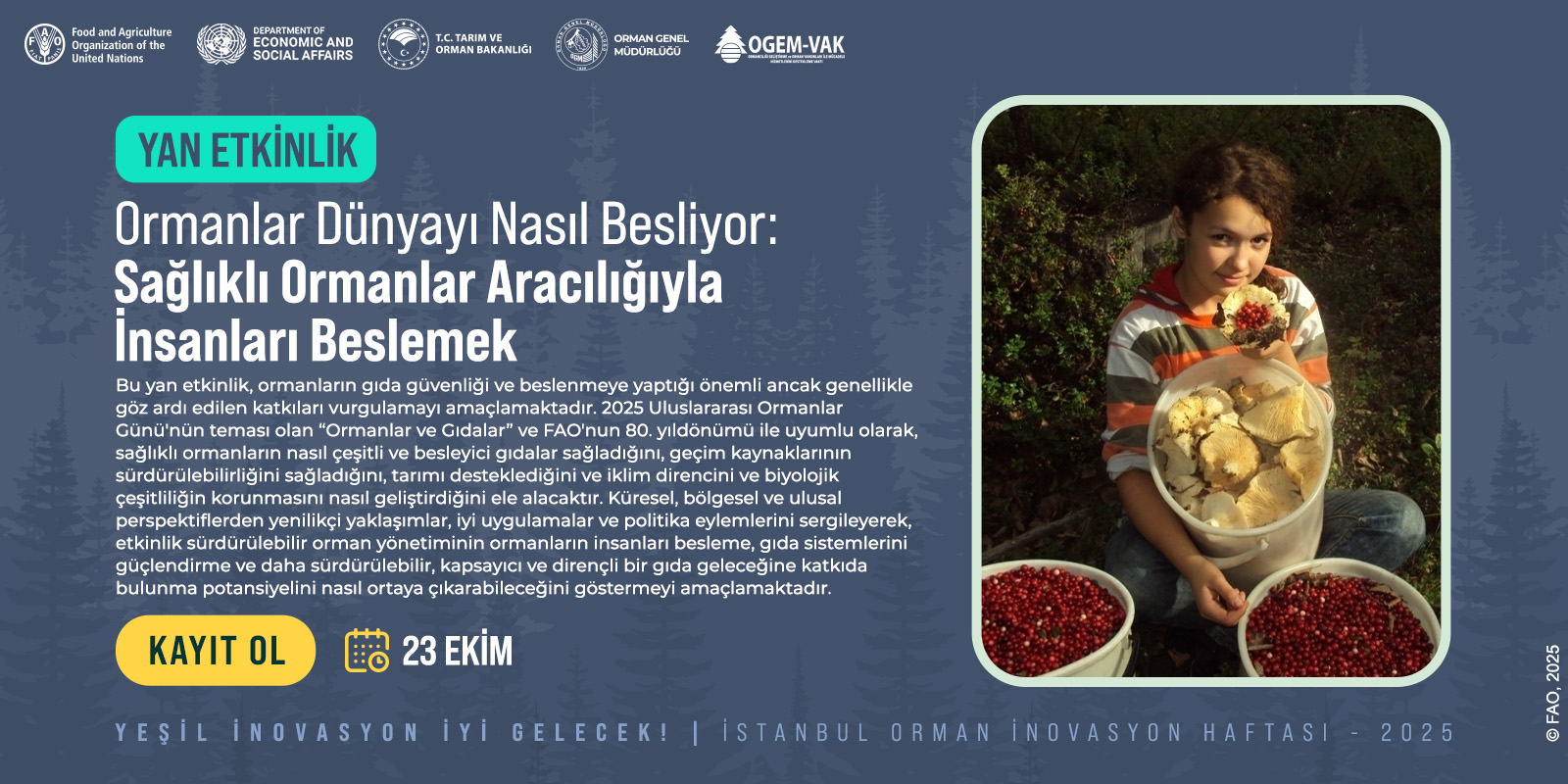 2025 FAO Avrupa Orman Haftası kapsamında İstanbul, Türkiye'de bir dizi yan etkinlik düzenlenecek. Bu yan etkinliklerde yenilikçi girişimler, bölgesel iş birlikleri ve ormancılık sektöründen ilham verici örnekler sergilenecek. Her bir yan etkinlik, uzmanlar, uygulayıcılar ve politika yapıcılar arasında diyalog, deneyim paylaşımı ve ortaklık kurma için bir platform sağlayacak.